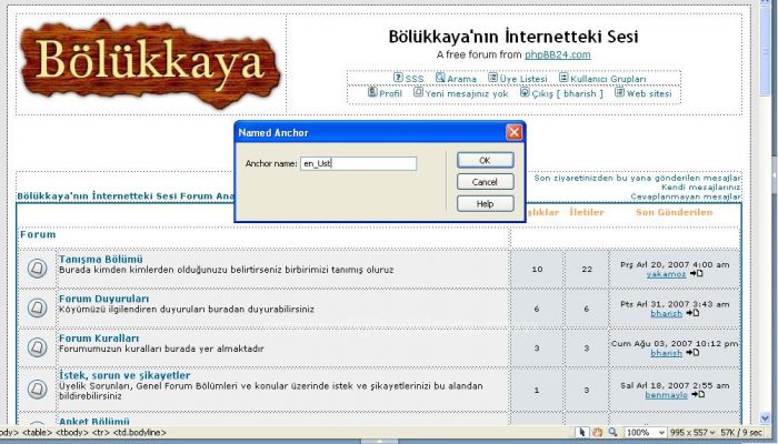 İlk olarak common araç çubuğundaki ‘Named Anchor’ simgesine tıklıyoruz tıkladıktan sonra aşağıdaki pencerede olduğu gibi oluşturacağımız durağın ismini gireriz: